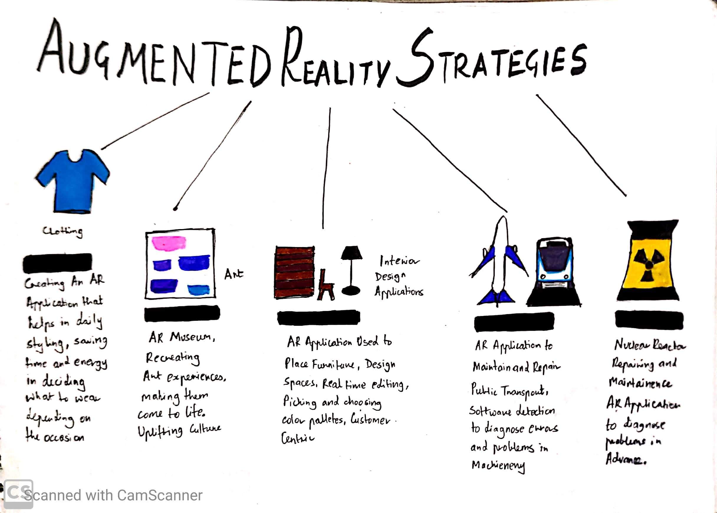 Process: In the following class from the three elements above I had decided to work with Augmented Reality Strategies, as I had read up a lot about it in the book “AI, Analytics and the New Machine Age” by Harvard Business Review. I had understood the concept as to how AR works and where it was currently being applied in the Industry. I then decided to make 5 iterations based on where I thought it was possible to use this technology to design better solutions for different industries. I came up with 5 iterations: A Fashion Styling Application, An Ar app to enhance art and artifact experiences in museums, An Ar Application to help customize furniture and design the interiors of spaces, An ar application to maintain and repair public transports such as airways and railways and an ar application to maintain and repair nuclear reactors.