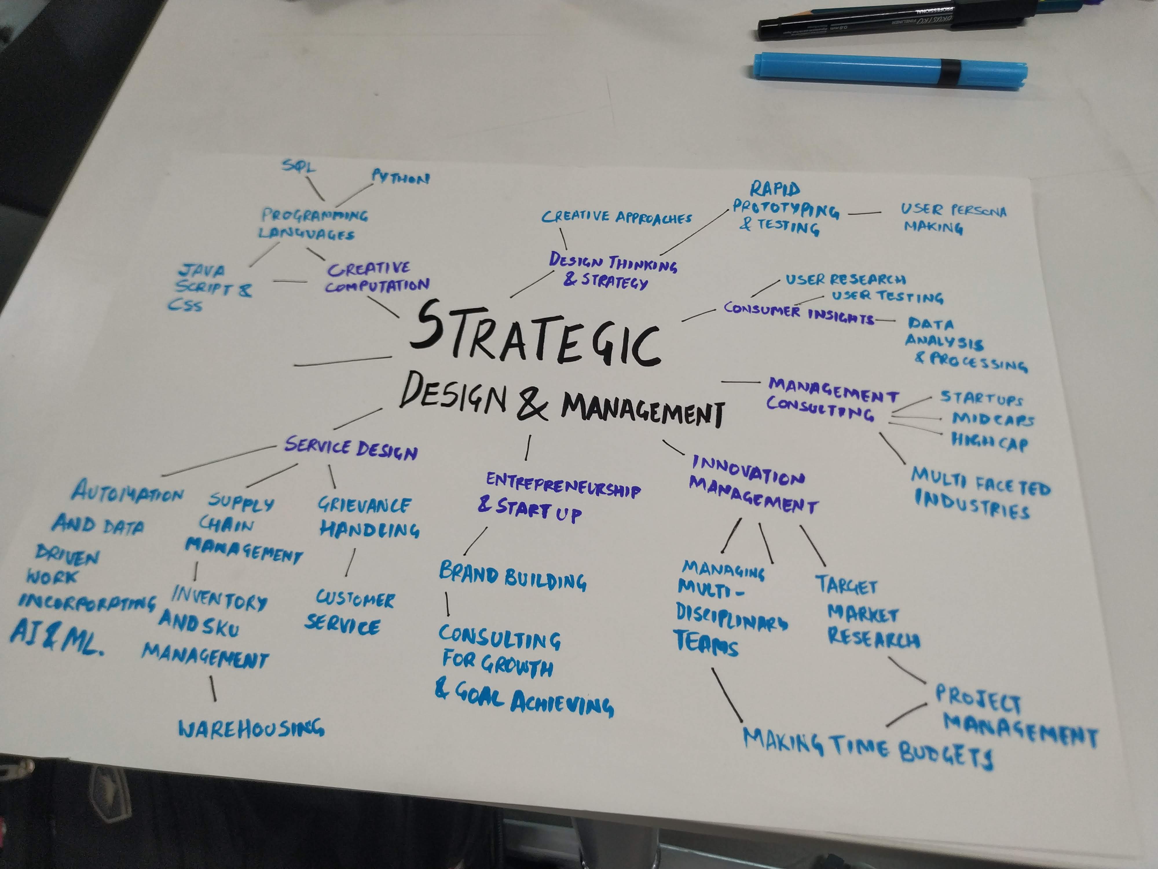 Process: In the following Integrative Studio class, I made a mind map of the three streams namely- Strategic Design Management, Product Design and Communication Design. While doing this task, we were to categorize and break down the stream into its respective elements and further break down those elements into it’s parts.