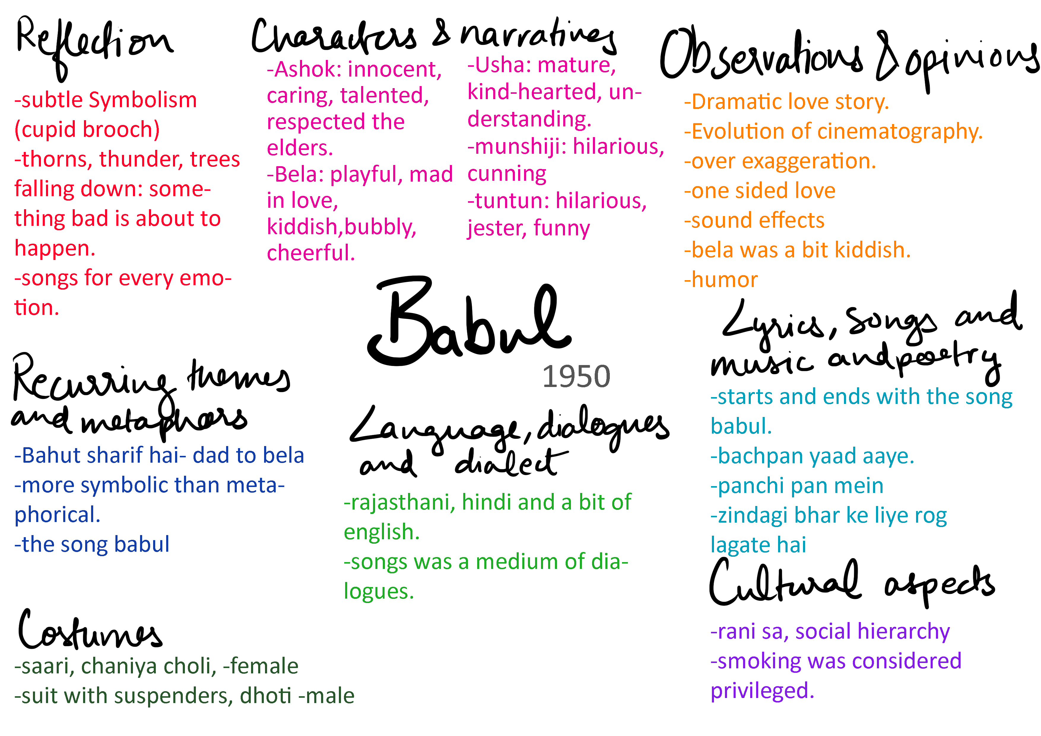 Reflections: While watching the two movies, I understood the problems that societal hierarchies had caused between two lovers, it also reflected upon how orthodox and tightly bounded by blind faith society was in those days. In Achhut Kanya, the brahmins to show their caste’s supremacy went ahead and burned down a fellow brahmins house as he was helping save a man of low stature. In Babul, there was a thinner line but a fine one that was defined more by income level rather than caste. Both the movies were similar to mela in their dramatic endings where one of the characters are killed off. I believe that in those days the only way to make people understand the severity behind a situation was to show drastic scenes towards the end of the movie so that the people retain the underlying message behind the movie and are drivers of change in society. In all the three movies a lot of importance is also given to showcase emotions through the lyrics in the songs by clever usage of metaphors. I believe that this was a great way to convey messages as messages are best retained through music and film.